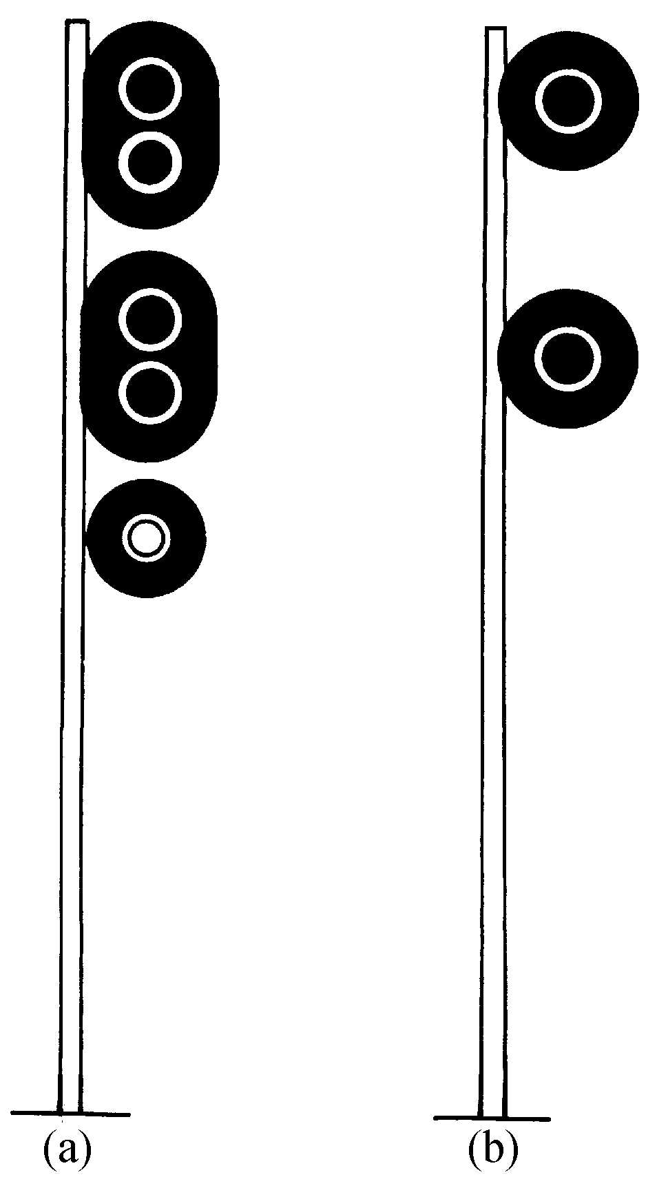 色燈信號機是鐵路利用燈光顏色、數目、亮燈狀態(穩定燈光或閃光燈光)顯示指揮行、調車作業命令的晝夜通用信號機。是鐵路信號系統的重要組成部分之一。按信號燈具結構不同可分為透鏡式和探照式兩類。透鏡式1個燈具只有1種顏色的燈光;探照式1個燈具可在3種不同顏色燈光之間變換。按安裝燈具的信號機柱的長短不同又有高柱和矮柱兩種。當受鐵路限界限制時,燈具也可以安裝在信號托架或信號橋上。按用途分有進站、出站、進路、通過、預告、容許、遮斷、調車、駝峰等色燈信號機。通常以綠色和黃色燈光(調車為月白色燈光)給出允許運行信號;紅色燈光(調車為藍色燈光)給出停車信號。以進站高柱色燈信號機為例,配置結構如下圖所示。圖中(a)為透鏡式,(b)為探照式。