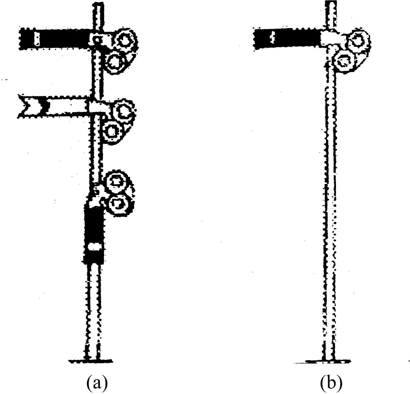 鐵路上利用在信號機柱上裝設不同顏色和數(shù)量的長方形和魚尾形臂板的位置和不同顏色的燈光顯示指揮行車命令的信號機。按用途分有進站、出站、通過及預告等臂板信號機。由電動機或機械帶動臂板轉換位置或燈光變換顏色。 臂板顯示晝間信號;燈光顯示夜間信號。顯示方式及意義為:停車信號——臂板在水平位置或與機柱重疊位置、1個紅色燈光或1個紅色燈光和1個黃色燈光;行進信號——臂板與機柱成45°角、1個綠色燈光或1個黃色燈光。結構示意如圖所示。圖(a)為進站信號機;圖(b)為出站和通過信號機。