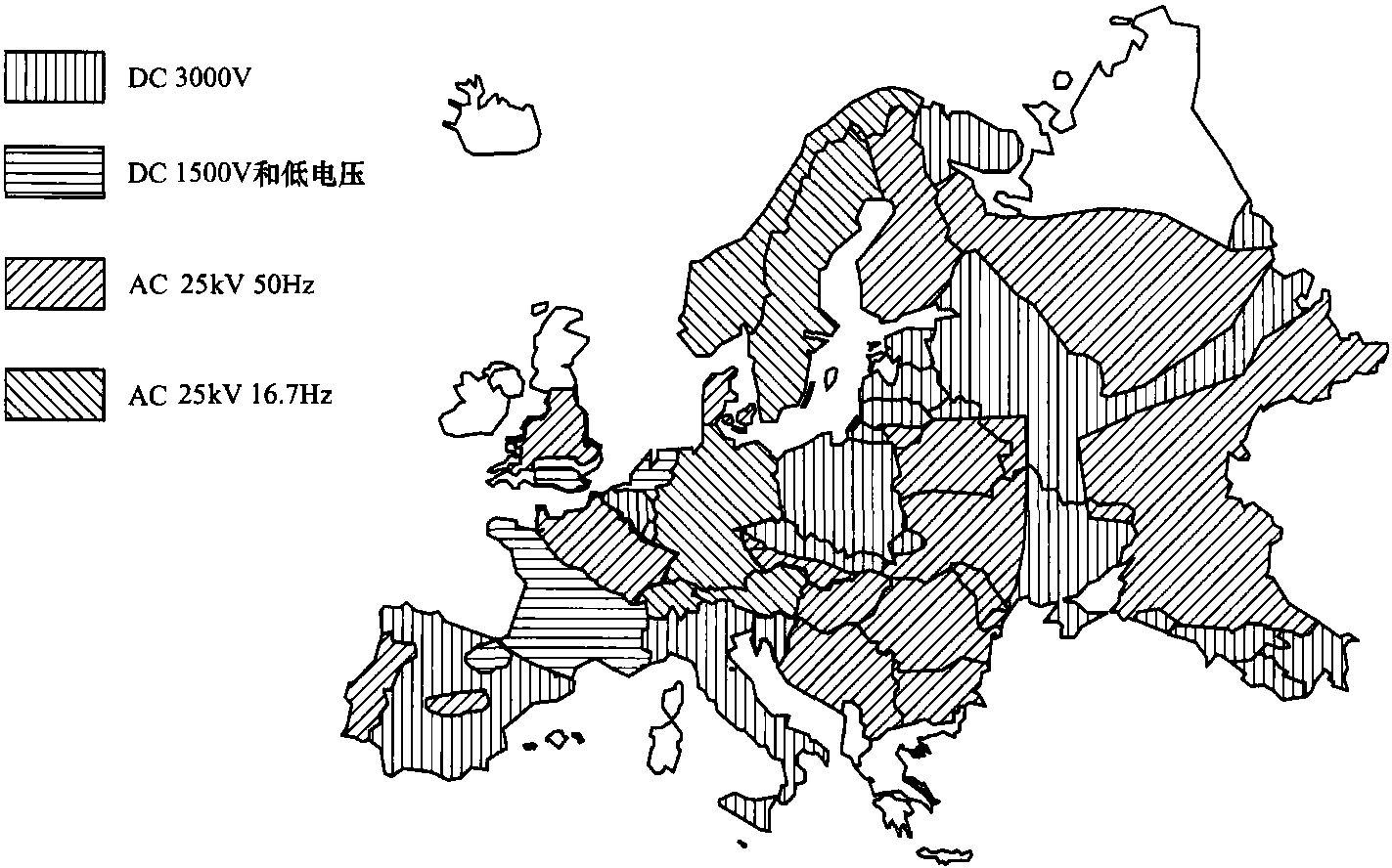 圖1.1所示為歐洲干線鐵路所使用的牽引電流系統。