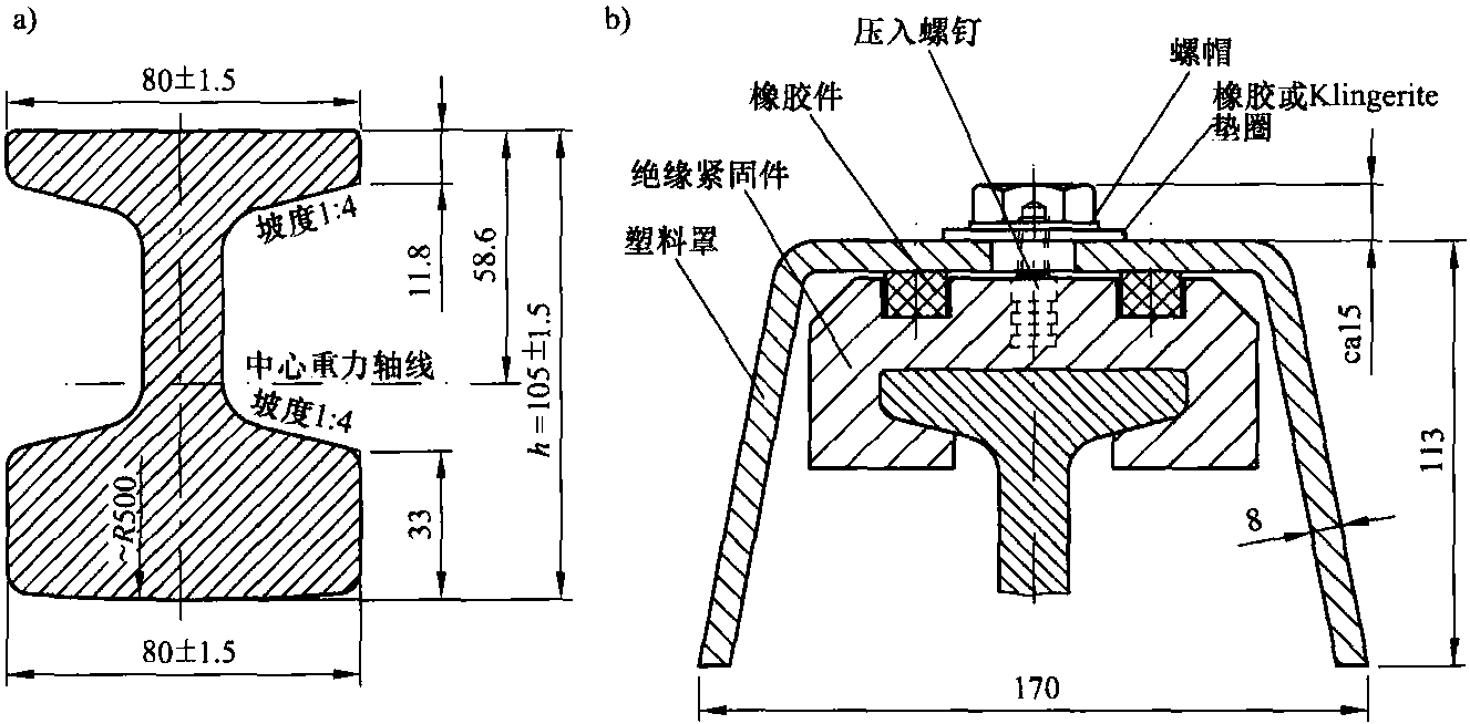 圖3.22為鋼鋁復(fù)合接觸軌系統(tǒng) [3.6],從圖中可見接觸軌支持裝置和用于鋼鋁復(fù)合第三軌的絕緣緊固件,這些緊固件可允許接觸軌縱向移動。這些接觸軌還罩有其機(jī)械、熱和電特性適應(yīng)各種環(huán)境條件的塑料套件。