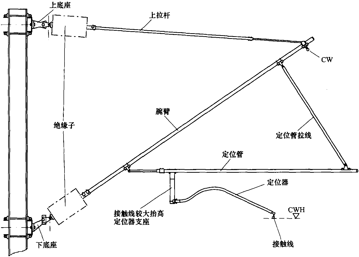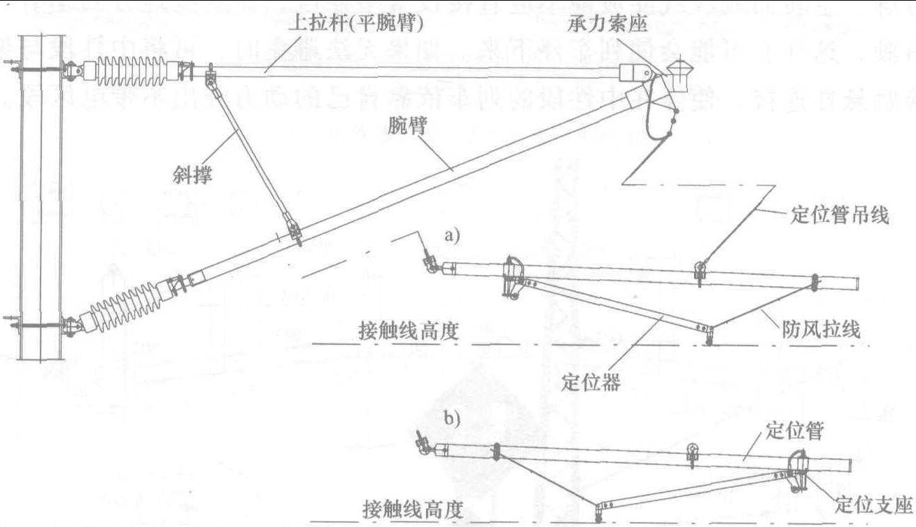 安裝在旋軸上的腕臂承載著自動補償的接觸懸掛,它可以在接觸懸掛因溫度變化發生位移時跟著移動。圖4.29是旋轉腕臂的設計結構。腕臂從功能上可分為接觸線支持裝置和承力索支持裝置。接觸線支持裝置包括定位管、定位支座、帶定位線夾的定位器、防風拉線和定位管吊線或定位斜撐。承力索支持裝置包括腕臂管、上拉桿 (平腕臂)、承力索座和管斜撐 (如果有的話)。腕臂通過絕緣子和允許做旋轉運動的旋轉腕臂底座固定在支柱或砌拱支架上。接觸線支持裝置分為兩種:正定位和反定位; 在正定位時,接觸線的偏移是朝著支持裝置方向拉出; 而在反定位時,接觸線的偏移是朝著遠離支柱方向推出。