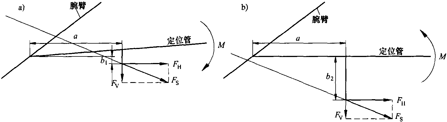 定位器是接觸線支持裝置中的重要部件,鋁型材定位器承受接觸線的橫向力可達2500N,使用它盡可能將接觸網上局部重量降到最低點。按照EN50119標準要求,當無抬升限制時,定位器應允許相應于雙倍預期抬升值進行動態向上運動; 有抬升限制時,允許預期抬升值的1.5倍向上運動。絕緣塑料定位器常用于城市交通系統中。防風拉線防止定位管和定位器在壓力荷載下變彎,并在逆風荷載下保持著接觸線的拉出值。它用于直線和半徑大于1200m的曲線上。接觸線在定位管的鉸接點上作用一個力矩M=a·Fv-b·FH,這里Fv是接觸線力的垂直分力,FH是接觸線力的水平分力。如果a·Fv>b·FH(圖4.30a),則在定位管處產生一個向下旋轉的力矩,它被吊弦抵消掉。如4.30所示,如果a·Fv<b2·FH,會產生一個向上旋轉的力矩,它只能由定位管和腕臂之間的定位管支撐抵消掉 (如圖4.31所示)。b取決于支撐的設計動態抬高值,在抬高位移大于150mm時常需要采用定位管支撐。