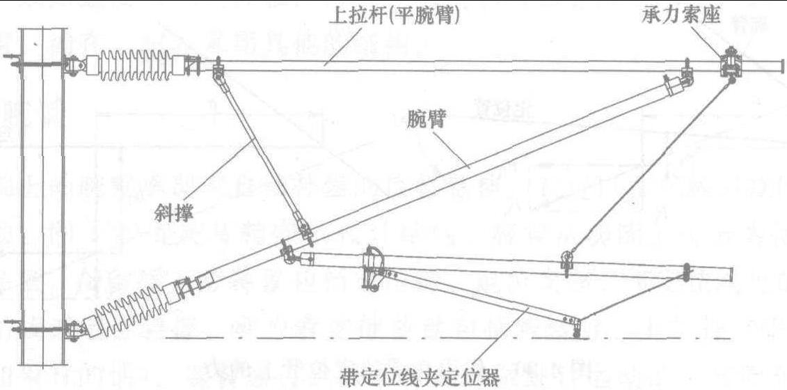 如果只能在鐵路的一邊立支柱,可以采用橫跨多線路的腕臂來解決這個問題。用拉線把一根橫臂固定連接在支柱上用來支撐安裝腕臂的吊柱 (如圖4.34所示)。多線路的腕臂在相鄰的接觸網之間不傳導機械振動。它滿足了通過機械式分隔相鄰線路接觸網裝置來實現不傳導振動以增加運行安全性的要求。