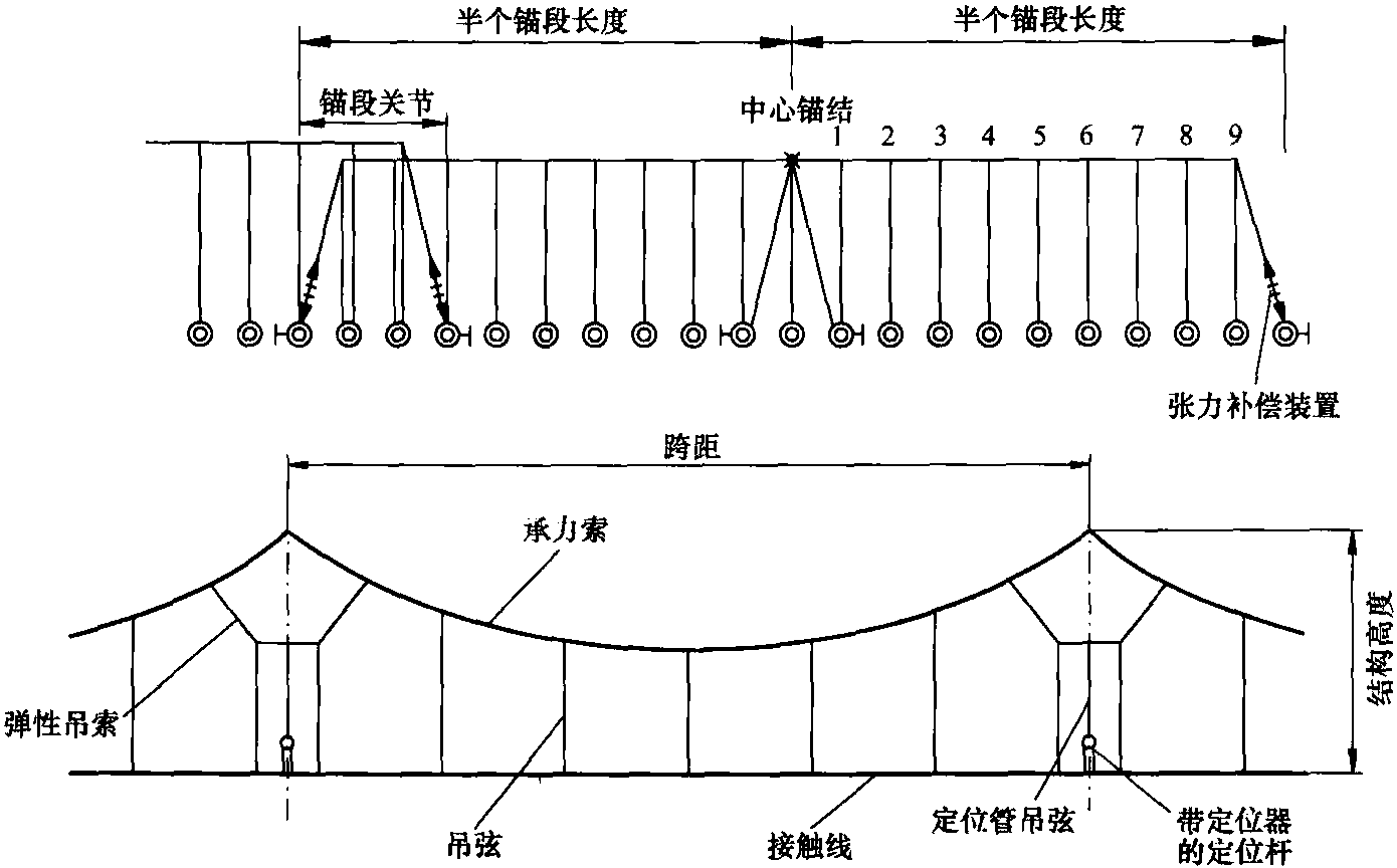 圖4.3是一種架空接觸網裝置的結構,是由各個跨組成的,跨度是根據接觸網的用途設計的。接觸網被分成各個獨立的錨段,在這些錨段的終端部位有終端硬錨設備或補償下錨裝置。補償裝置保持接觸線和承力索張力在溫度變化時恒定不變。在接近錨段的中心處有一個中心錨結,它起著固定接觸網裝置并保證沿軌道方向的穩定性。錨段關節提供了兩個相鄰接觸網錨段之間的過渡,也被稱作重疊區段或平行跨——兩支接觸懸掛平行懸掛。接觸網的設計必須滿足靜態、動態、熱及電氣要求。各個參數對接觸網性能的影響和作用將在相關的章節中介紹。