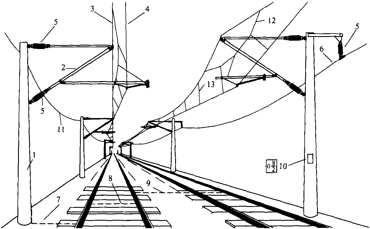 1—支柱; 2—腕臂; 3—承力索; 4—接觸線; 5—絕緣子; 6—供電線; 7—支柱至鋼軌接地線; 8—鋼軌電連接線; 9—上下行鋼軌電連接線; 10—支柱標識牌; 11—回流線;12—彈性吊索; 13—吊弦