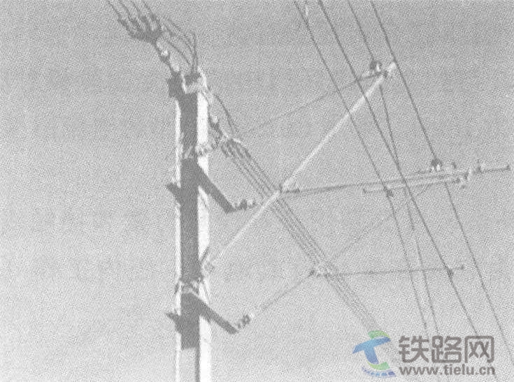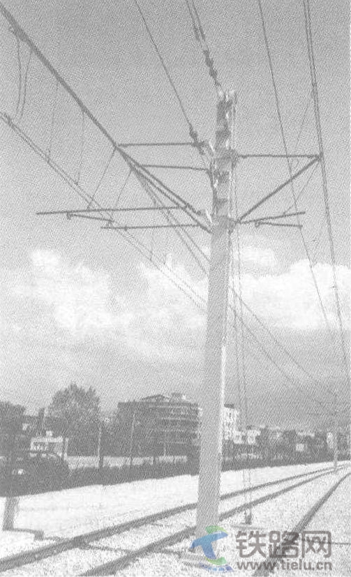 為了用鐵路把機場和Hillsboro郊區與波特蘭中心輕軌系統連接起來,分別建成了29km和8.8km的兩條延長線,作為53km鐵路網的一部分。采用的是輕軌接觸網,工作電壓為直流750V。這種接觸網設計考慮了溫度范圍為-30~+50℃的特殊氣候條件。至Hillsboro郊區的延長線安裝了一種直鏈形懸掛接觸網設備,其接觸線為Cu AC-152mm2(300MCM),承力索截面為162mm2 (250MCM),溫度60℃時張力均為15kN (圖4.80)。到機場的延長線采用的是水平鏈形結構。最大跨距為64m,支柱采用的是H形鋼柱或鋼管支柱 (圖4.81)。