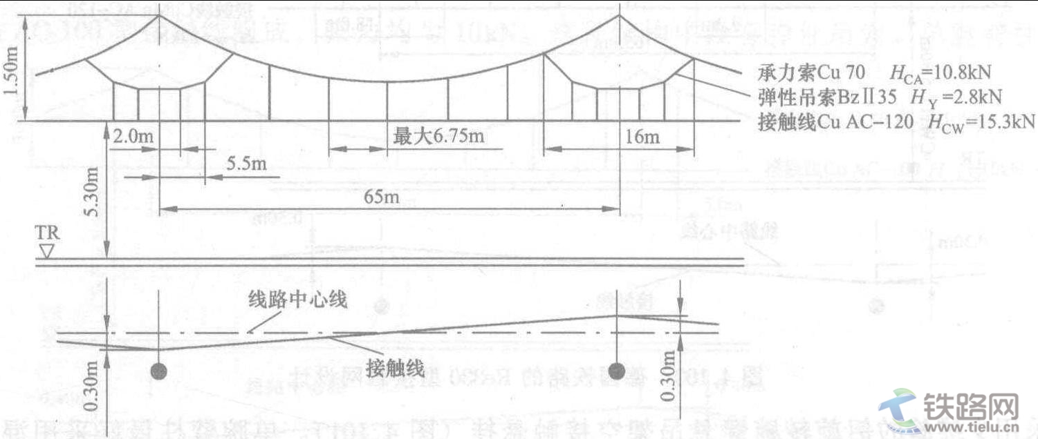 接觸網由截面為70mm2的銅承力索和Cu AC-120型接觸線組成。主要采用半張力補償形式。最大補償長度為750m,一端是硬錨,另一端是墜砣補償。圖4.102是標準接觸網的布置圖。