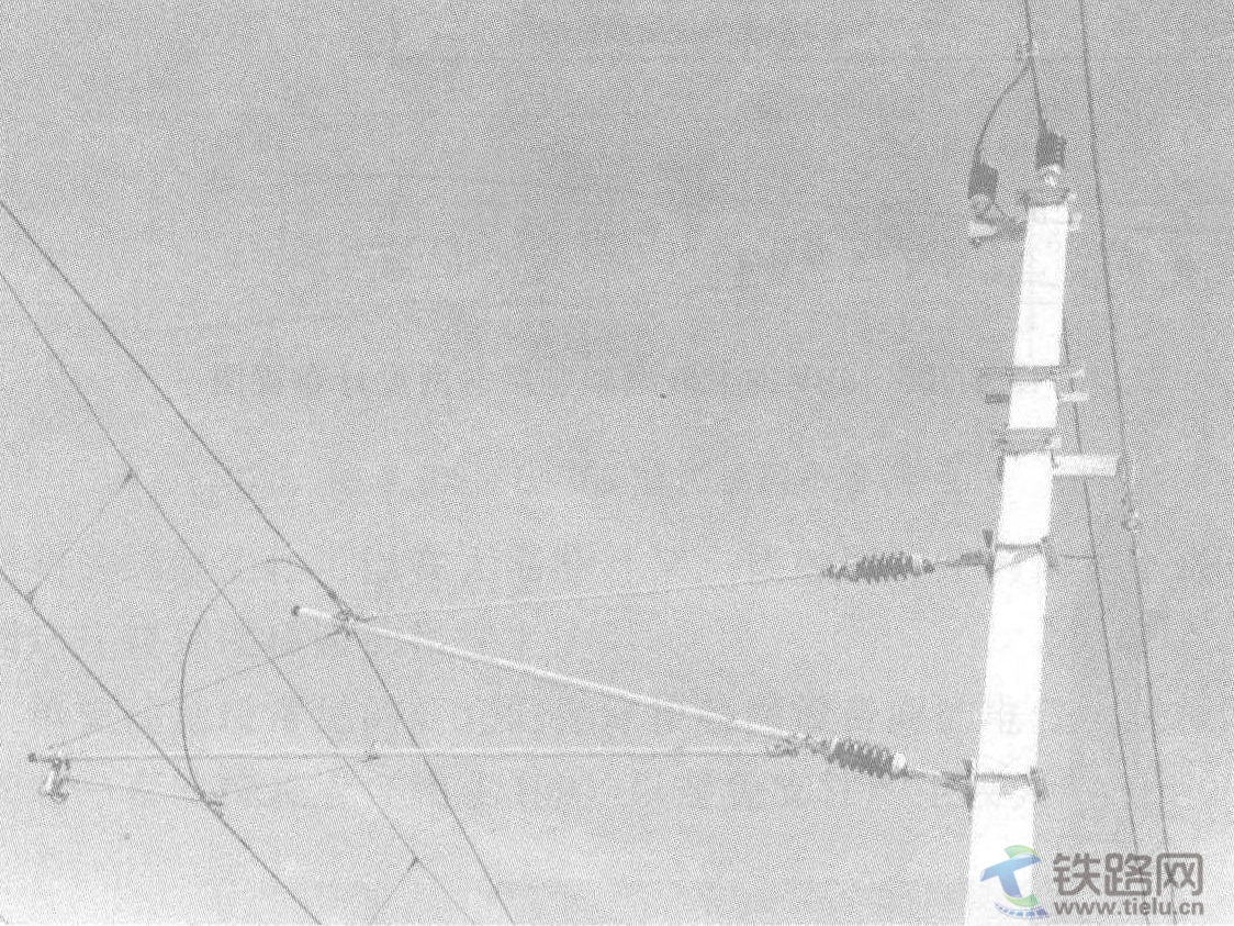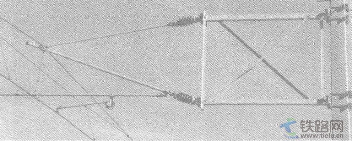 由ACSR260/23組成的加強線被架設在支柱頂部的柱形絕緣子上 (圖4.103)。在站區內,奧地利國有鐵路公司采用軟橫跨來懸吊接觸懸掛。主要采用的是帶電的上定位索和帶吊弦的承力索支持裝置。定位索用彈簧固定在矩形混凝土支柱上。圖4.104是站臺區上用的單腕臂。