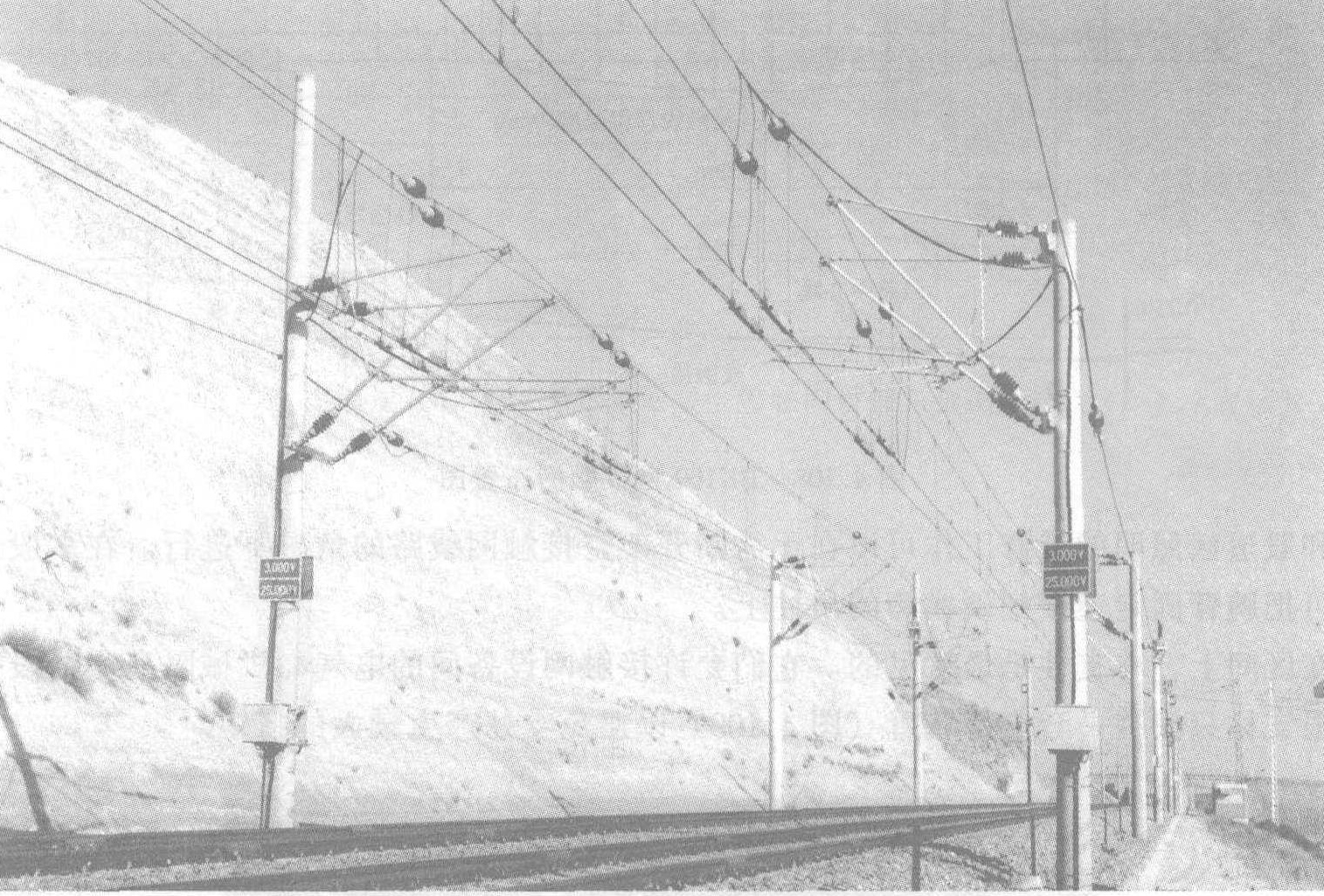 西班牙國有鐵路局 (RENFE) 的馬德里—塞維利亞段高速鐵路線是1992年竣工的。采用Bz70型承力索和Cu AC-120型接觸線的架空接觸網設計,該接觸網與德國鐵路的Re250型接觸網設計類似。與德國作法不同的是,該線在支柱上安裝了回流線以提高電流回歸。道岔和轉線軌道架設有交叉接觸網。在交流25kV、50Hz電力牽引供電情況下,采用中性段把由各個變電所供電的區(qū)段分隔開,中性段還用來分開直流3kV和交流25kV供電的區(qū)段 (圖4.110)。