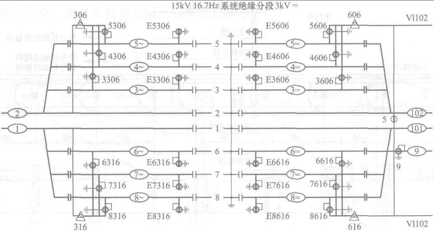在旋轉接觸網或進行裝載作業前,裝載和檢測軌道上方的接觸網必須斷電并接地。如果接觸網需要頻繁地進行開關和接地操作,如裝載和海關檢查線上方的接觸網可以使用類似于圖8.2所示的開關裝置和操作設備來簡化操作。圖8.31所示的布置方案被鐵路運行人員稱之為海關或安全接線。接觸網由分段絕緣器分開,通過單獨的隔離開關按股道分別進行供電或接地。由于設計有站內系統絕緣分段,每一股道都配備兩套開關裝置,每一套開關裝置對應一個供電分區。每一股道的兩端各有一個控制柱,經過授權的人方可通過此控制柱進行開關操作。它們可以通過鑰匙和按動按鈕來申請違反接觸網最小凈空操作許可并拒絕接觸網重新送電。進行此操作時,本地的列車管理人員無需和總控制中心商量就可通過當地控制盤將接觸網斷電和接地。然后將接觸網斷電狀態信號發送給控制柱。只有當所有的接觸網作業檢查監督人員都確認可以重新供電后,本地的列車管理人員才能開鎖并按動按鈕,向接觸網重新送電。