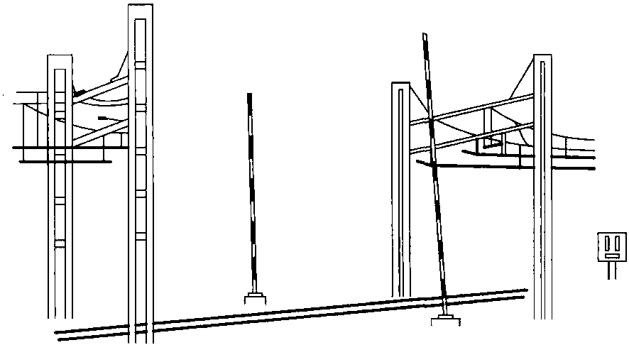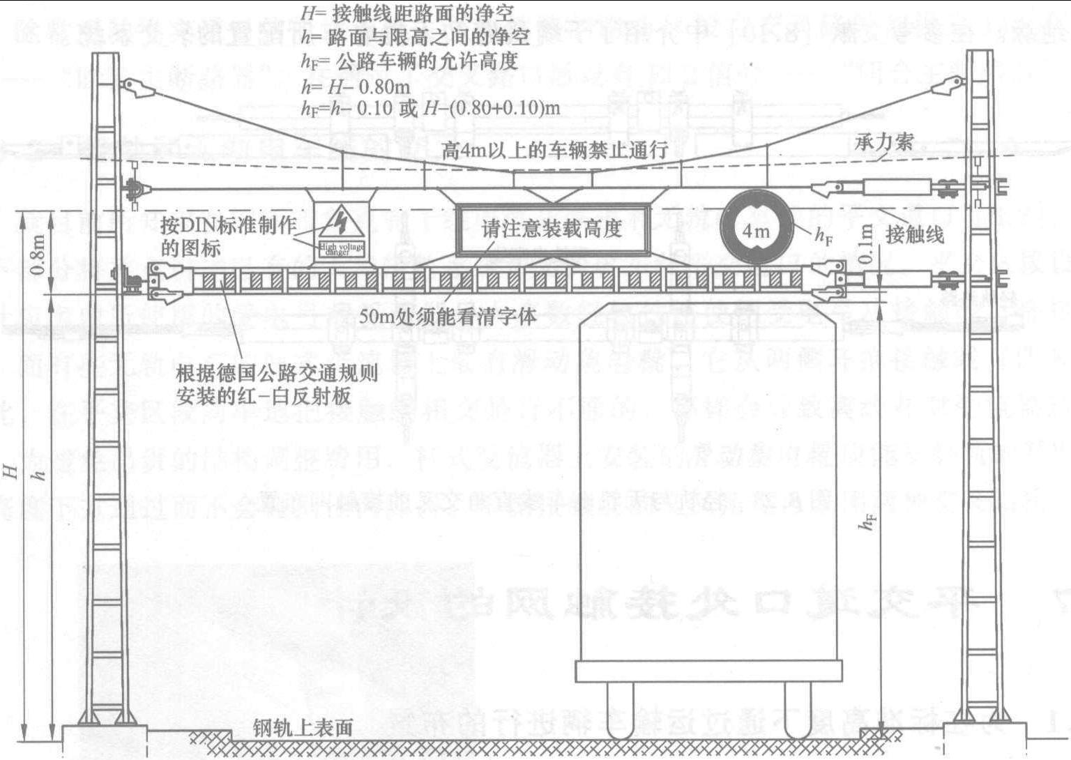 如果平交道口處接觸線下降并低于上述最小高度,則必須在平交道口處設置限制公路車輛高度用的高度限制結構來保護平交道口處的裝置。同時要配有警示標志,上面有 “小心,高壓危險” 的標識,還要按照德國公路交通規則設置相應的 (StVO) 交通禁止標志。圖8.24所示為限制高度的限界門,限界門的下沿距接觸線0.8m。交通標志牌上顯示的最高限度一定要小于實際限制高度0.1m。這樣的措施在鐵路穿過低矮橋梁時是必要的。例如,平交道口處的步行橋就會降低接觸網的凈空高度。