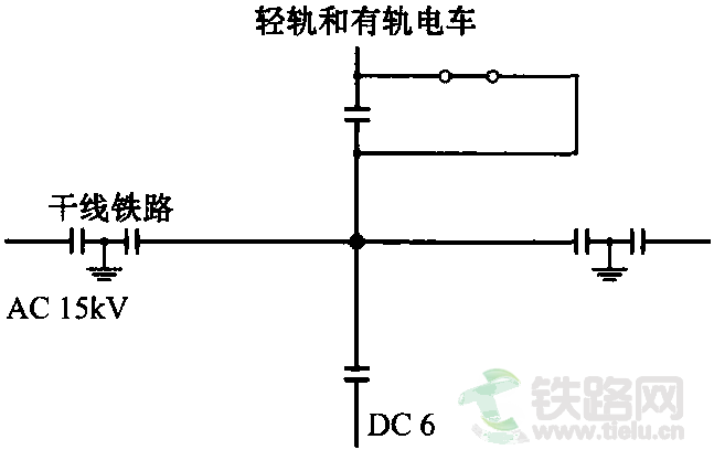 鐵路干線和城市輕軌平交道口的另一種設計方案如圖8.20的所示,它向干線鐵路的絕緣區段和中央區段供電的電壓為AC 15 kV。