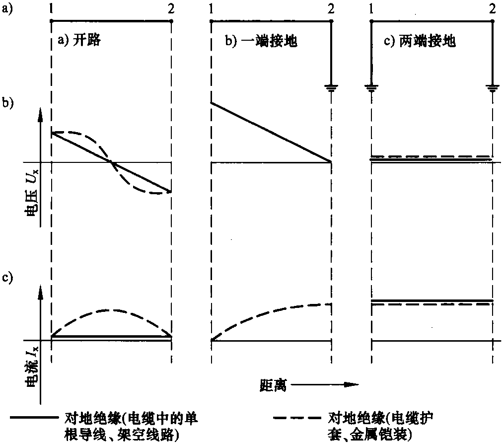 Zw和γ按照式 (12.16) 和式 (12.17) 計算。常數A和B是受影響線路的特征函數,取決于線路終端的接線狀態。所謂接線狀態,是說明電纜終端是如何連接的。圖13.12所示為鄰近鐵路的電纜終端的典型接線狀態。