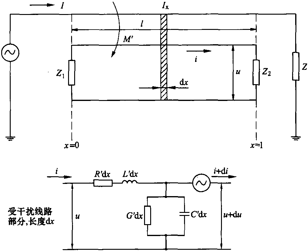 對牽引接觸網周邊的導體的電感影響可以用相互平行的兩個導體—大地回路之間的感性耦合來描述。如圖13.11所示,假定受到干擾的導體位于某一鐵路區段中,該干擾源系統接觸網—鋼軌—大地的交叉影響是可以忽略的。