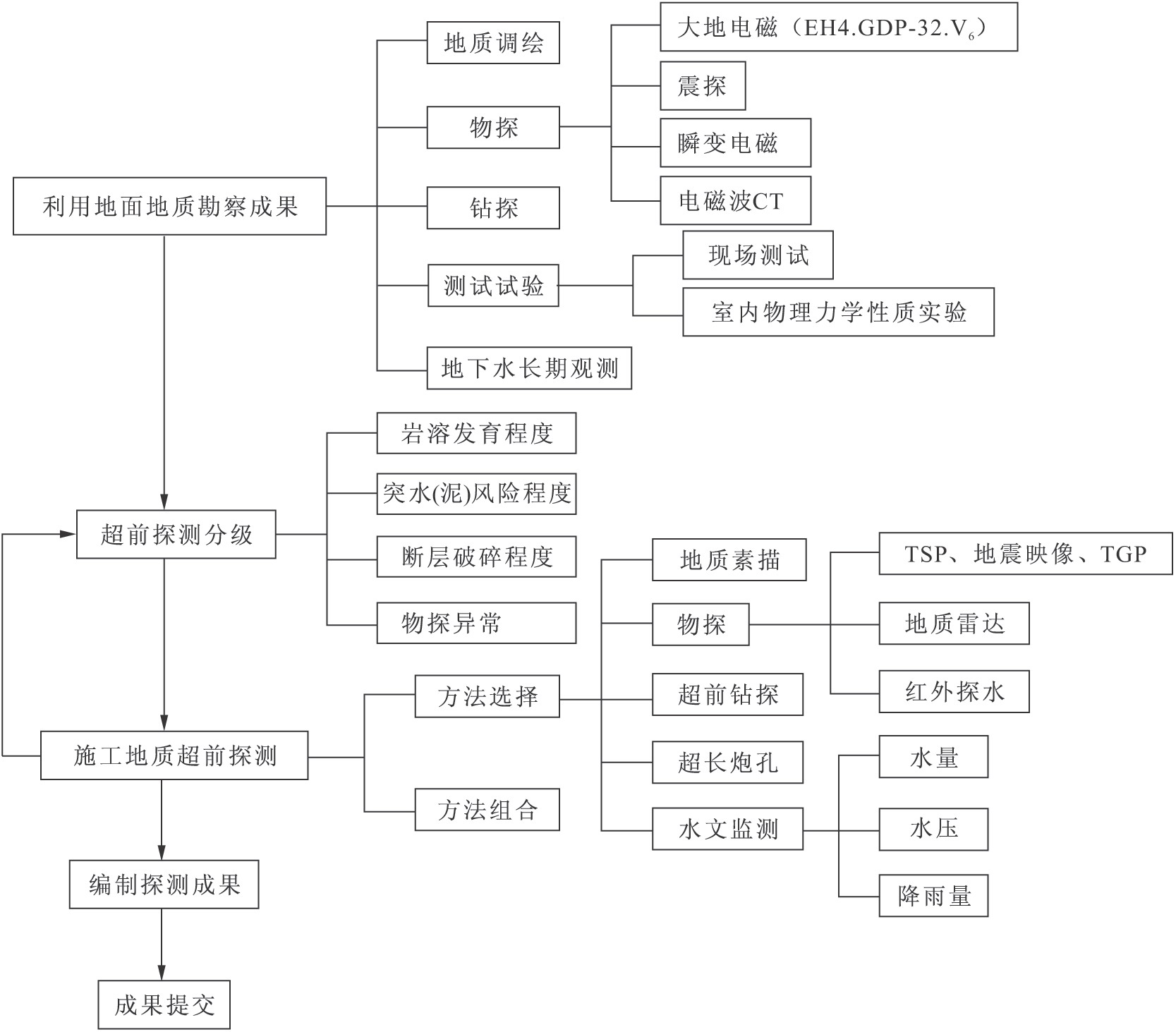 第二,按不同分級的施工地質(zhì)超前探測組合模式,合理選擇超前探測方法進(jìn)行施工地質(zhì)超前探測,并根據(jù)超前探測成果動態(tài)調(diào)整分級。
