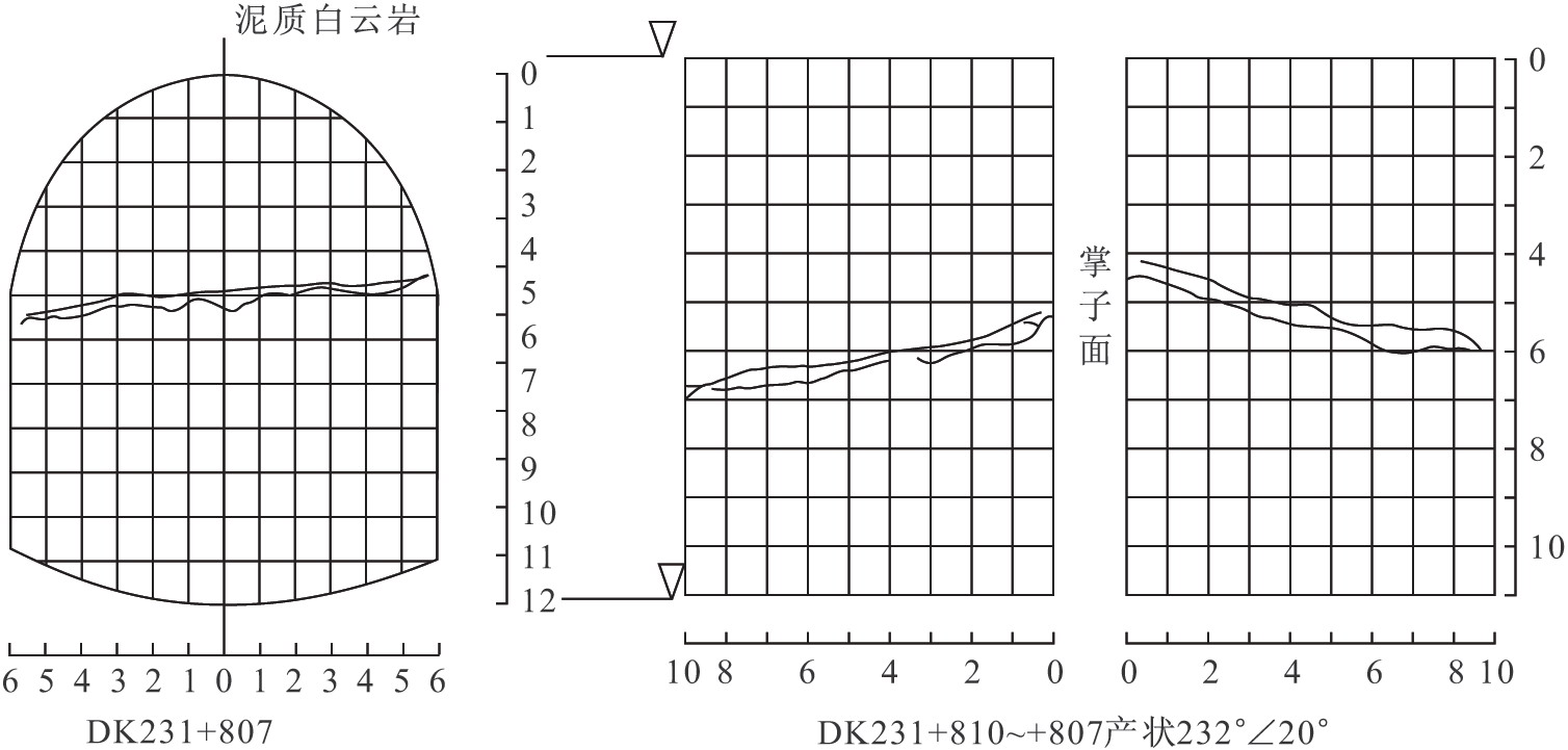 龍麟宮隧道DK231+807掌子面為泥質白云巖,在掌子面離隧底5.7m處有一順層的含泥裂隙夾層,如圖6-3所示。巖層產狀232°∠20°,洞身走向為北209°。tanβ′=tan20°×sin23°,β′=8.09°,H=5.7/tan8.09°=40.1(m)。經計算該含泥裂隙在掌子面前方40m處延伸到洞外。