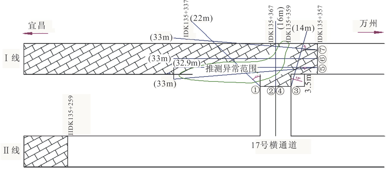 宜萬線大部分隧道在正線的一側采用了平導導坑法超前施工,因此可利用平導對正線隧道洞身進行超前探測。