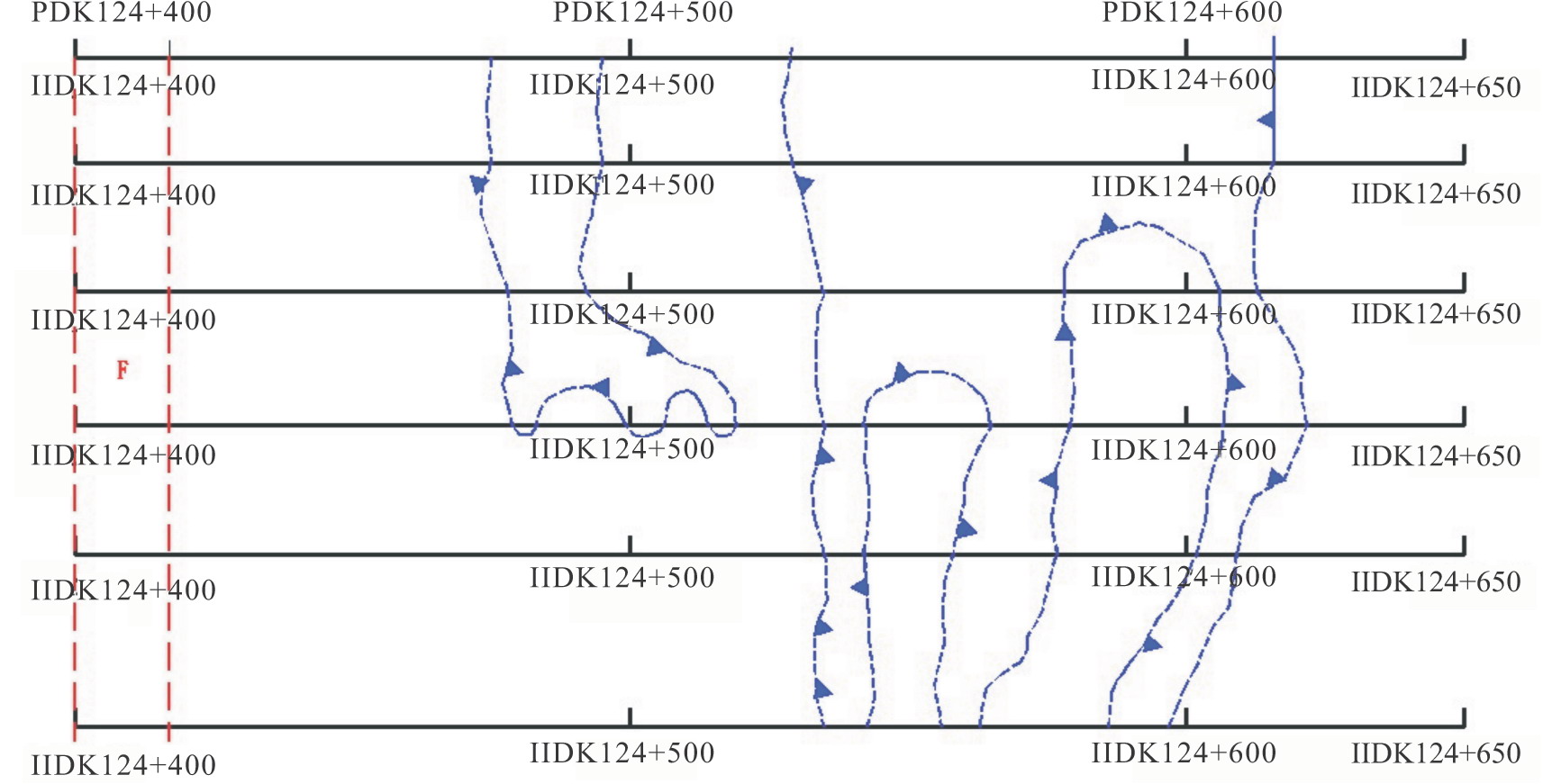圖6-34野三關隧道平導對Ⅰ測線洞身探測PDK124+400~+600段平面成果圖