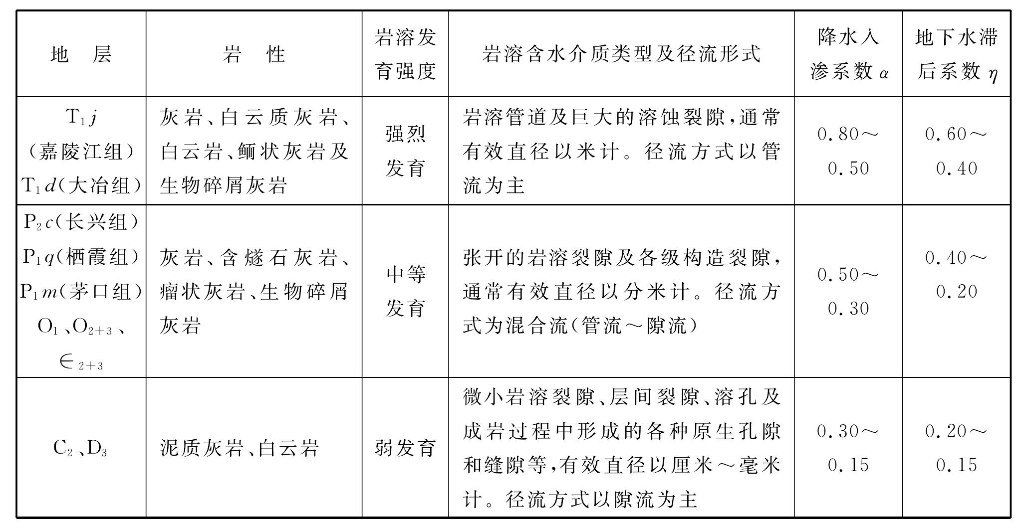 表7-4宜萬鐵路碳酸鹽巖降水入滲系數(shù)α、地下水滯后系數(shù)η表