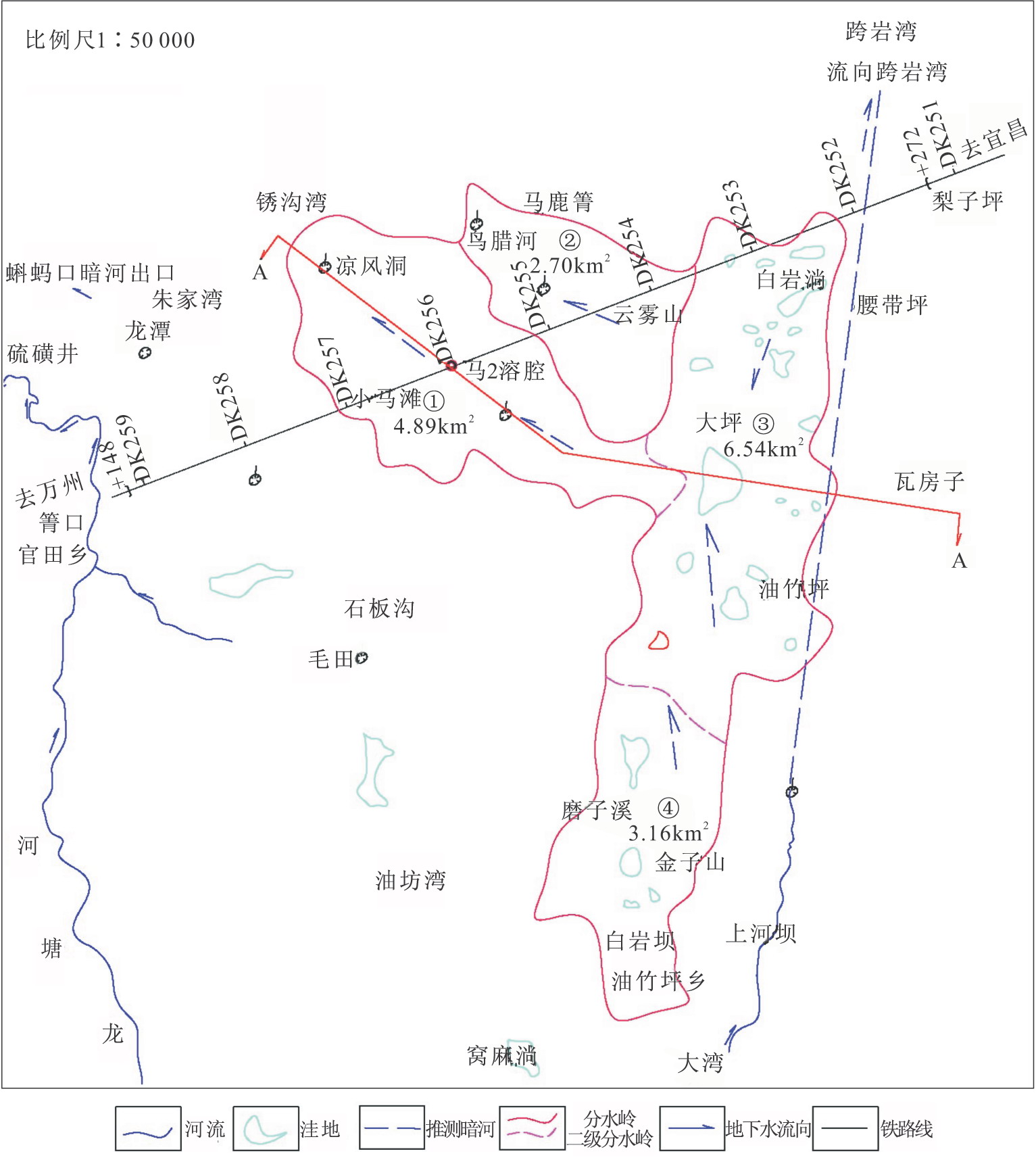 PDK255+978溶腔巖溶水系統隸屬于小溪河地下河系統上游箐口子系統的分支——小馬灘地下河系統,小馬灘地下河系統上游油竹坪巖溶臺原、洼地區為補給區,集水面積共計14.59km2,其中巖溶水補給徑流區(小馬灘峰叢溝谷區)面積4.89km2,如圖7-3、圖7-8所示。