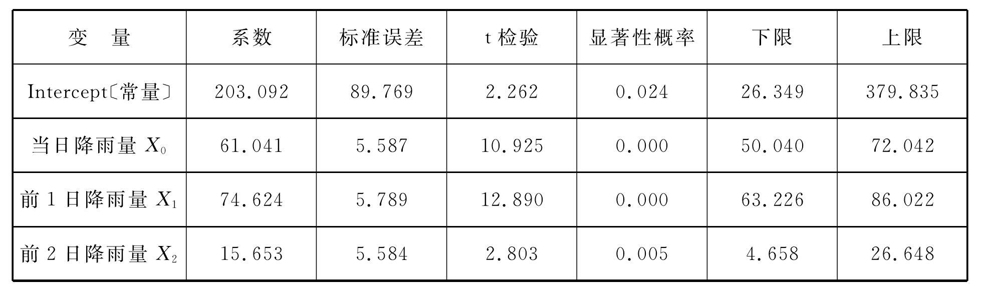 長觀資料表明,一般在中、大雨的第二天,地下水流量明顯增長,第4天達到峰值,所以首先選取當日降雨量(X0)、前1日降雨量(X1)、前2日降雨量(X2)、前3日降雨量(X3)、前4日降雨量(X4)、前5日降雨量(X5)與隧道泄水洞流量(Q)進行相關分析。結果表明,只有當日降雨量(X0)、前1日降雨量(X1)和前2日降雨量(X2)的相關系數通過了顯著性檢驗,說明降雨影響因素中,它們對涌水量的影響最顯著,故選取這三個量作為自變量,建立與因變量(隧道泄水洞流量Q)之間的回歸方程。