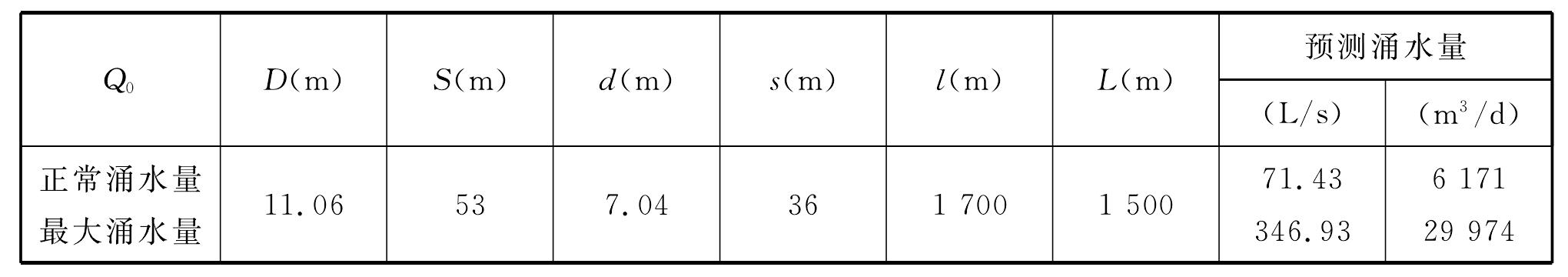 隧道進口段灰巖地層中發育有大、小魚泉兩條暗河,兩暗河的排泄口分別位于隧道進口的兩側,排泄口標高與隧道進口標高相近,暗河順巖層走向發育,與隧道近似垂直,地下水補給主要為大氣降水補給,補給面積分別為14.76 km2、11.78 km2,共計26.54km2。齊岳山隧道進口(DK361+270~DK362+720)段與隧道線北約2km處石洞子煤礦主巷道屬一個巖溶地下水系統,為齊岳山背斜南東翼,巖溶含水層系嘉陵江組與大冶組,地下水沿巖溶含水層走向運動,補給、徑流、排泄條件相同,均位于溶蝕裂隙、溶洞帶(強巖溶發育帶),齊岳山隧道DK361+270~DK362+720段標高(1 123m)與石洞子煤礦主巷道標高(1 137m)也比較接近,因而可根據石洞子煤礦主巷道涌水特征,應用水文地質比擬法對齊岳山隧道DK361+270~DK362+720段進行涌水預測。