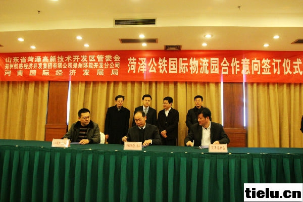 圖為山東省菏澤市高新技術開發區管委會副書記、常務副主任郝丕進(右一)代表甲方,鄭州鐵路經濟開發集團有限公司鄭州環能開發分公司總經理焦慶(左一)代表乙方,河南國際經濟發展局局長王鵬杰(中)代表丙方,在會簽“菏澤公鐵國際物流園”合作意向書。(張大軍 徐翔 文/圖 徐麟)
