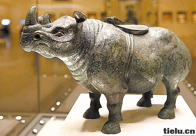 一個春寒料峭的周末,我在國家博物館的陳列大廳,看到了一件令人驚詫不已、使人激動萬狀的青銅器。這件青銅器的造型是一尊犀牛,通高約30多厘米,身長約50多厘米,昂首佇立,寫實而生動。犀牛首有兩角,背上有蓋與前脊背相連,能啟合,嘴邊右側有一直徑約兩厘米細長之管狀流,通體由流暢的回旋形線條組合成復雜多變的帶狀紋飾,猶似流動的祥云。犀牛身上那歷盡歲月滄桑的斑斑綠色青銅銹,把我的思緒拉得遙遠而悠長……