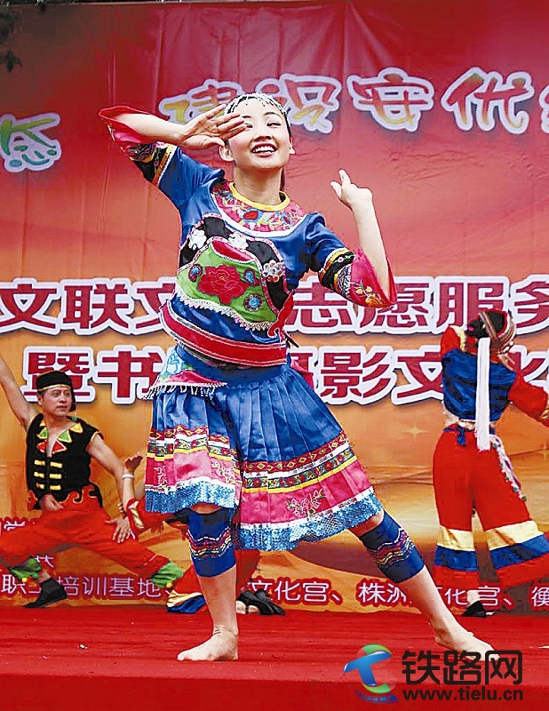 全場(chǎng)20個(gè)節(jié)目,最值得一提的是壓軸戲 《民族和諧滿園春》。這是一個(gè)由株洲鐵路文化宮群星藝術(shù)團(tuán)的50多名業(yè)余演員參與表演的大型舞蹈。今年春節(jié)期間,這個(gè)舞蹈曾作為壓軸戲登上了株洲電視臺(tái)舉辦的春節(jié)聯(lián)歡晚會(huì)。