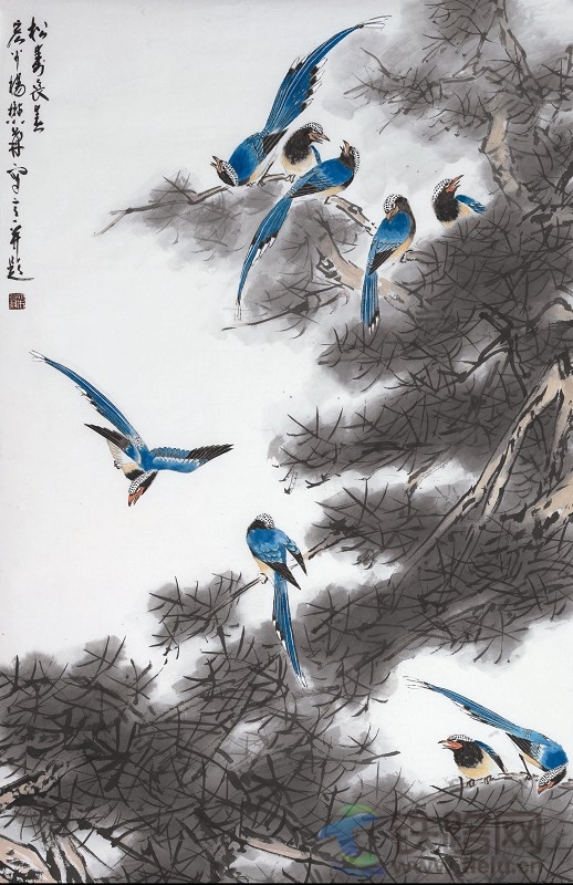 1992年楊懋森應邀創作的 《春光爛漫圖》在天安門城樓上亮展;1985年創作的 《雙壽圖》參加中國美協、中國書協聯展獲二等獎;2006年應邀在韓國首爾舉辦了楊懋森中國花鳥畫個人展;由孫其峰題款的 《楊懋森花鳥作品集》一經出版發行便好評如潮;2013年其以髦耋之年創作的橫3.5米、縱1.45米的巨幅力作 《百鳥朝鳳圖》更是令人拍案叫絕。畫面里工中有寫,寫中有工,讓觀者感受到百鳥舞天地的大美生命氣象。