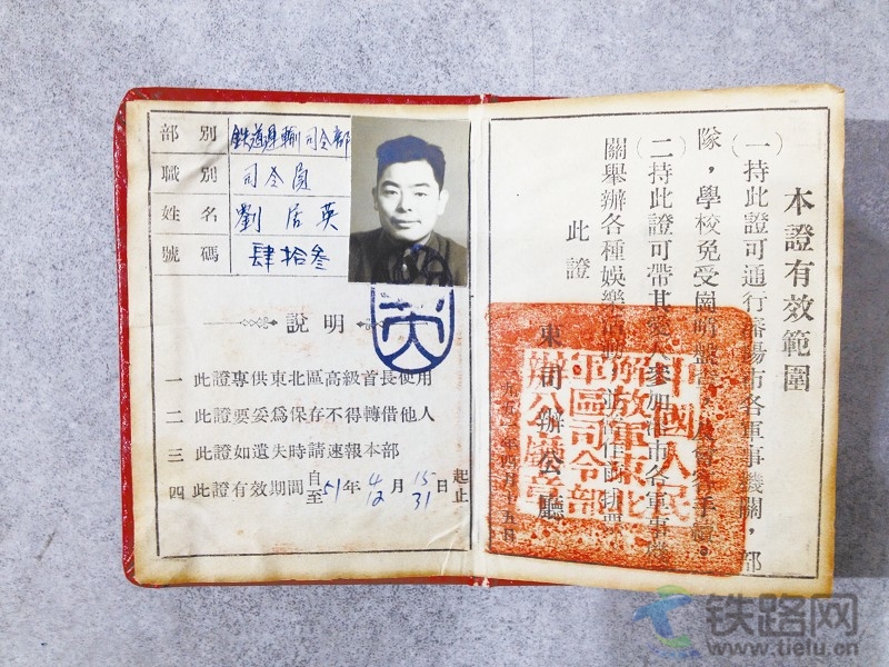 這是一張中國(guó)人民解放軍東北軍區(qū)司令部辦公廳于1951年4月15日頒發(fā)給時(shí)任東北軍區(qū)鐵道運(yùn)輸司令部司令員劉居英的特別通行證。該通行證為紅色防水油印紙裝封皮,封面字均為豎排版,右上角印著宋體字 “一九五一年用”,中間帶有 “八一”字樣的紅五星下印有黑色繁體字“特別通行證”,左下角印黑色繁體字 “東司辦公廳制”。內(nèi)芯2張4頁(yè),首頁(yè)與封面字相同,第2頁(yè)是 “本證有效范圍”: “持此證可通行沈陽(yáng)市各軍事機(jī)關(guān)、部隊(duì)、學(xué)校免受崗哨盤查,及會(huì)手續(xù)。持此證可帶愛人參加沈市各軍事機(jī)關(guān)舉辦各種娛樂活動(dòng),并當(dāng)作前排票”,上蓋 “中國(guó)人民解放軍東北軍區(qū)司令部辦公廳章”。第3頁(yè)是帶有圖片的證件內(nèi)容:上半部為部別,鐵道運(yùn)輸司令部;職別,司令員;號(hào)碼,肆拾叁。下半部為使用說(shuō)明:一,此證專供東北區(qū)高級(jí)首長(zhǎng)使用;二,此證要妥為保存不得轉(zhuǎn)借他人;三,此證如遺失時(shí)請(qǐng)速報(bào)本部;四,此證有效期為1951年4月15日至1951年12月31日。第4頁(yè)空白。