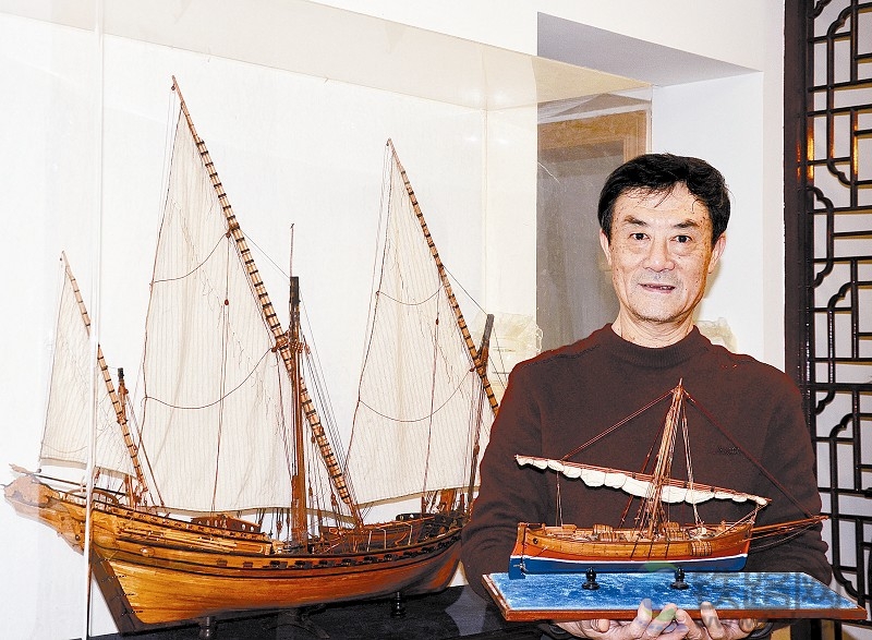 圖為鄭基和他制作的船模,岳正供圖