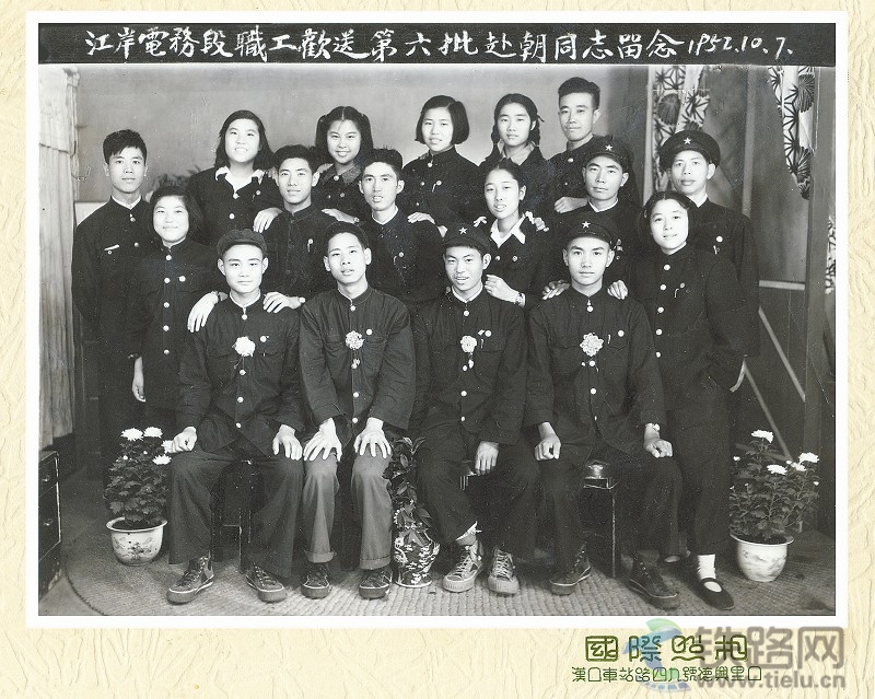 細雨瀟瀟,潤物無聲,2016年春天的腳步輕輕且匆匆,寒意尚未退去,一覺醒來,已是滿眼的新綠。口袋里的手機嗡嗡一震,是同事馬艷發來的微信,我預感可能是打聽的事情有眉目了。打開微信,一張略微發黃的黑白照片躍入我的眼簾,照片上有一排小字 “江岸電務段職工歡送第六批赴朝同志留念1952.10.7”。樸素的衣裝、真誠的笑容、自豪的神情、自信的目光,照片里的人清一色的深藍色鐵路制服,他們風華正茂,他們意氣風發,他們是共和國新一代的鐵路職工,他們是祖國大動脈里奔流的激情澎湃的熱血。