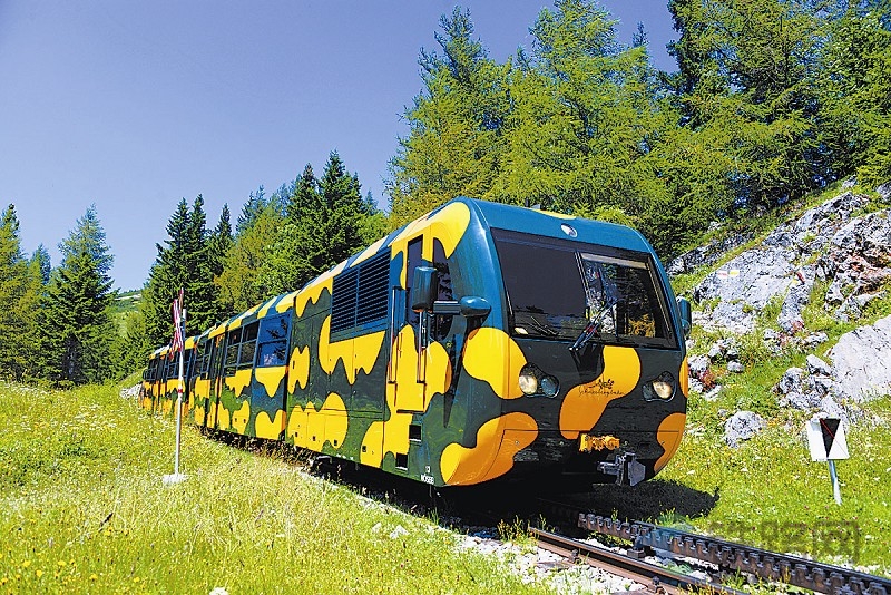 如果說登山鐵路也要找一個吉祥物,大家會選擇誰呢?奧地利施內山登山鐵路另辟蹊徑,把蠑螈作為自己的代言人,不僅把蠑螈畫像搬上了車頭,車身也涂裝得色彩斑斕。穿行山間,活脫靈巧的 “蠑螈”吸附在巖壁上攀爬而行,成為遠近聞名的明星。