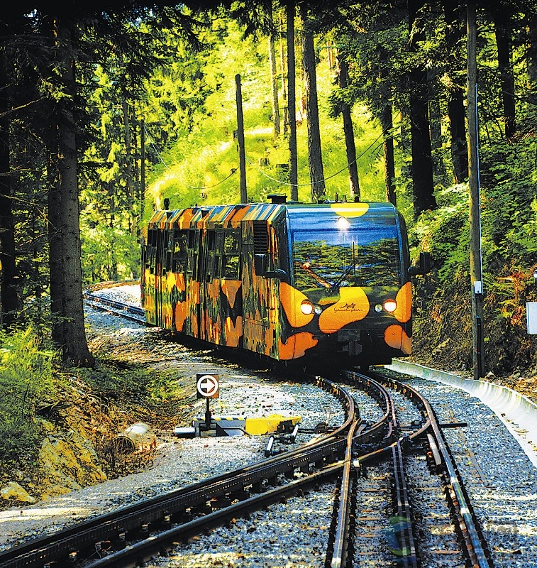 從奧地利首都維也納乘坐去往格拉茨方向的RJ高速列車,只需30分鐘便可抵達維也納新城火車站。從這里換乘支線上運行的內燃小火車,在阿爾卑斯山麓恬靜的村莊與丘陵間再行駛50分鐘,便可抵達施內山下的普赫伯格。從小鎮向西眺望,雄偉的施內山橫亙,普赫伯格火車站站臺對面則是數列五顏六色的登山小火車。這里便是施內山登山鐵路的起點。相比歐洲其他地方的登山鐵路,施內山的風景并非最出眾的,但色彩斑斕、酷似蠑螈的登山列車卻讓這條鐵路格外引人注目。