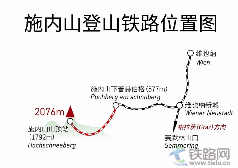 1897年,施內山登山鐵路建成通車,僅用了兩年。當年的登山鐵路分為兩段,第一段是從維也納至格拉茨鐵路干線上的維也納新城站出岔,以普通支線鐵路的方式通往山腳下的普赫伯格;第二段則是從普赫伯格開始用齒軌鐵路爬上山頂的線路。后來,隨著鐵路的兼并重組,如今從維也納新城到普赫伯格間的支線鐵路已歸入奧地利國家鐵路網,因此施內山登山鐵路便更多地特指從普赫伯格到施內山山頂的這段登山線路了。