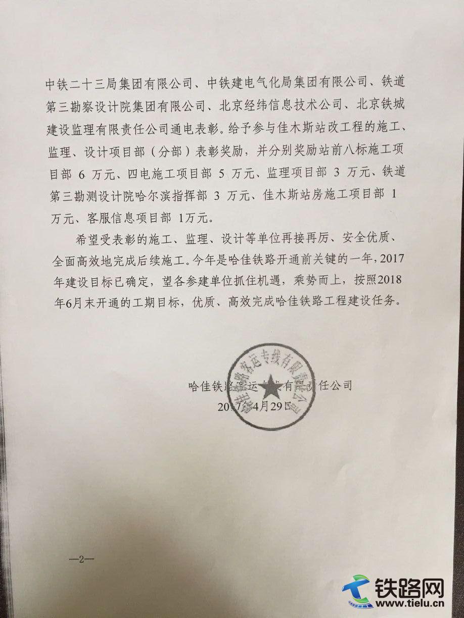 近日,中鐵二十三局哈佳協調指揮部捷報頻傳,繼4月29日清晨由項目部組織施工的佳木斯站改過渡工程(8—12線)提前順利通車后,鑒于項目部的施工組織得力,哈佳鐵路客運專線有限責任公司又發來嘉獎電,給予哈佳項目部(站前八標施工項目部)通電嘉獎,并獎勵項目部6萬元。