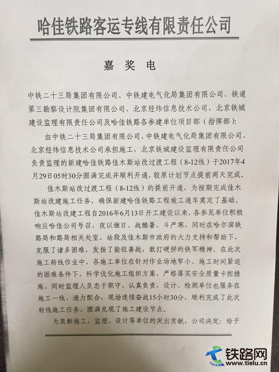 在嘉獎電中,哈佳鐵路客運專線有限責任公司對集團公司哈佳項目部自去年6月站內改造開工以來的施工組織通報表揚,贊揚哈佳項目部積極響應哈佳公司號召,夜以繼日,戰酷暑,斗嚴寒,克服了諸多困難,發揚了能征善戰、敢打硬拼的鐵軍精神,特別是在此次轉線施工中,針對作業場地窄小,施工時間緊迫的困難條件,科學優化施組方案,嚴格落實安全質量卡控措施,圓滿兌現了施工建設節點。